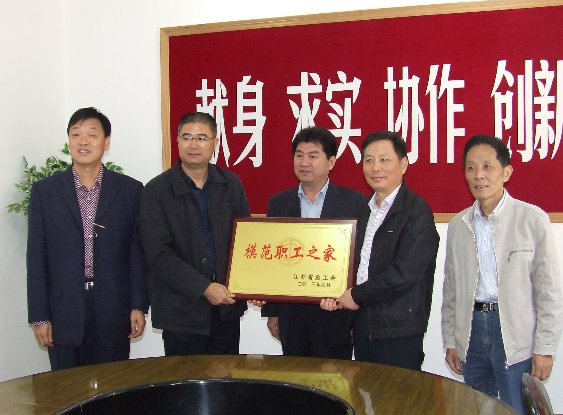 10月16日上午,受江苏省总工会委托,宜兴市总工会党组书记周亚定专程来我公司举行“江苏省模范职工之家”授牌仪式,他将牌匾送到公司副总经理、工会主席王锡林手中,希望我公司工会继续发挥“职工之家”作用,为职工做好服务,努力构建和谐企业。丁蜀镇总工会副主席张志敏,公司董事长、总经理、党委书记邱永斌等出席了仪式。