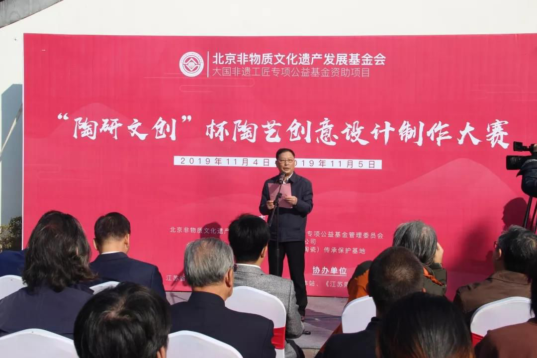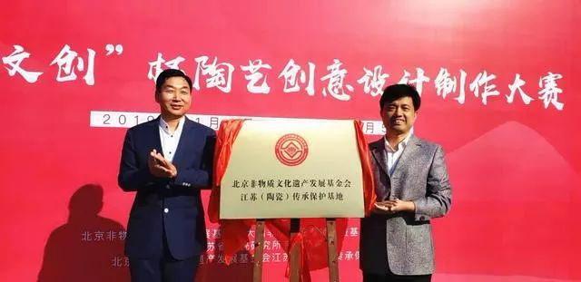 北京非物质文化遗产发展基金会理事长陈四光、宜兴市副市长储红飙共同为江苏(陶瓷)传承保护基地揭牌