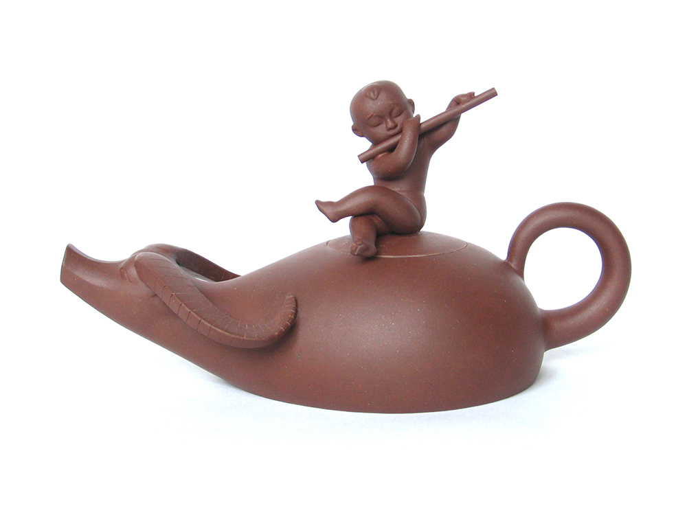 此作品将雕塑与壶的功能巧妙结合,小牧童坐在牛背上悠闲自得地吹着笛子,看似雕塑,实则茶壶,妙趣横生,整个造型别致美观。