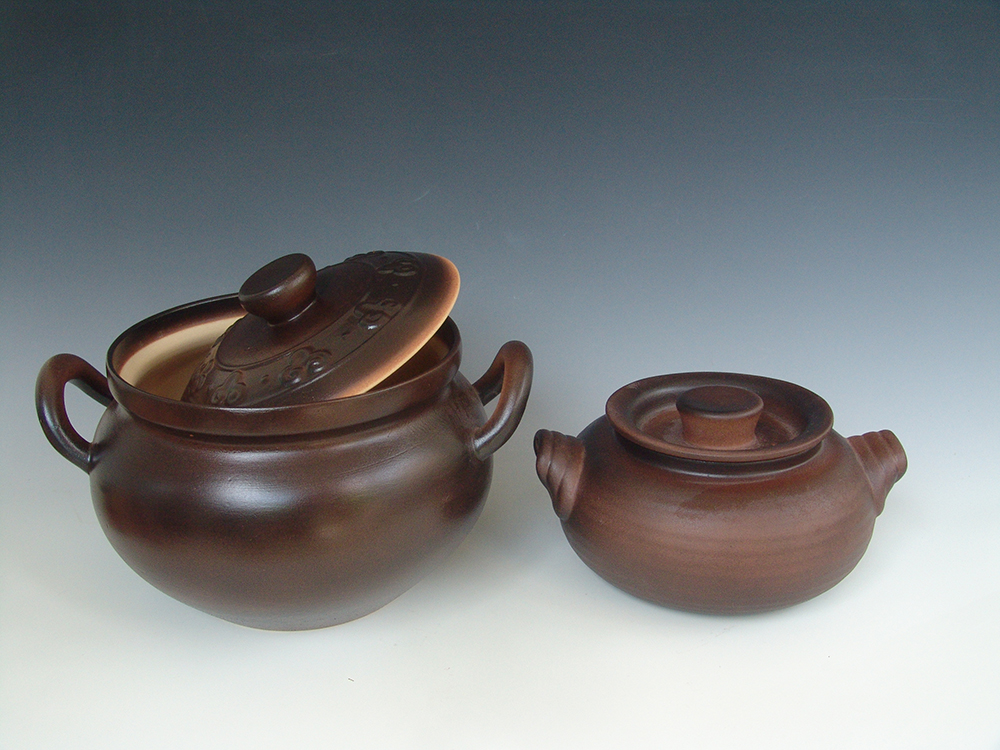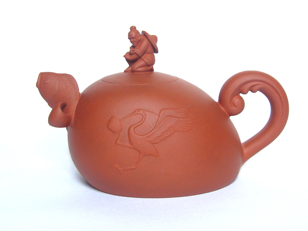 此作品巧妙的将一句成语(鹬蚌相争,渔翁得利)演变成壶的造型,充分表现了这句成语的深刻含义,整个造型将雕塑元素和茶壶元素溶为一体,相得益彰。